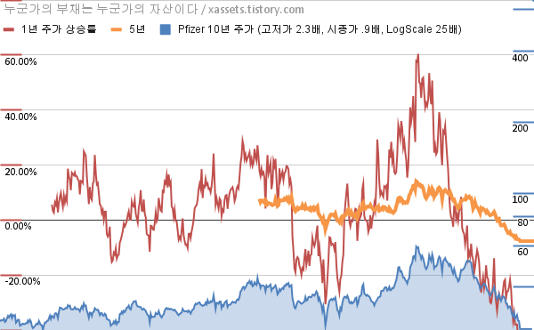 - 포스팅일 기준, 화이자의 1, 3, 5, 10년 연평균 주가상승률은 -48.19%, -10.93%, -7.68%, -0.86%이다.