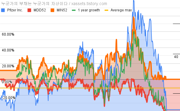 - 화이자의 10년 평균 MDD는 -11.06%고, 52주 최저가 대비 평균 상승률은 18.66%다.