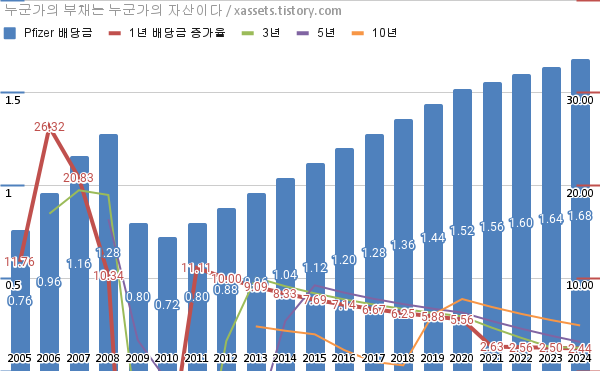 화이자 배당금 및 배당성장률 차트 (2005년~2024년)