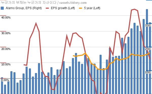 - 포스팅일 기준, 알라모 그룹의 1, 5년 연평균 EPS 성장률은 12.18%, 16.38%이다.
