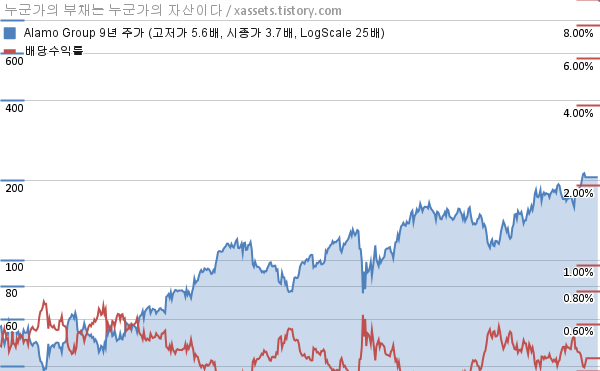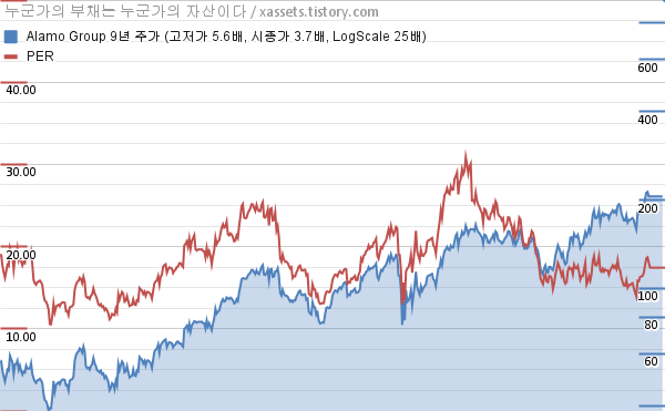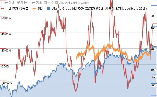 - 포스팅일 기준, 알라모 그룹의 1, 3, 5, 10년 연평균 주가상승률은 50.60%, 15.63%, 22.72%, 14.30%이다.