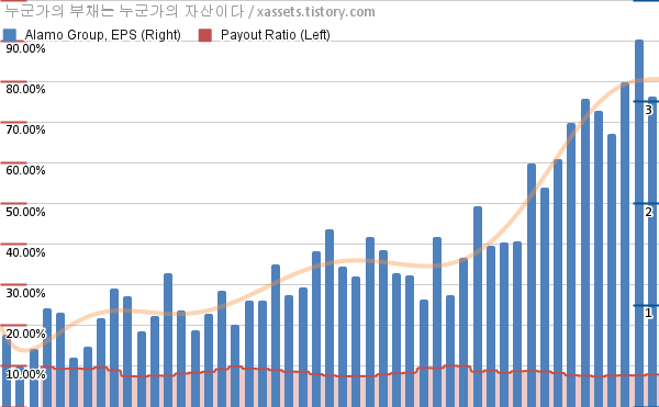 알라모 그룹 EPS 성장률, 배당성향 차트 (2012년~2024년)