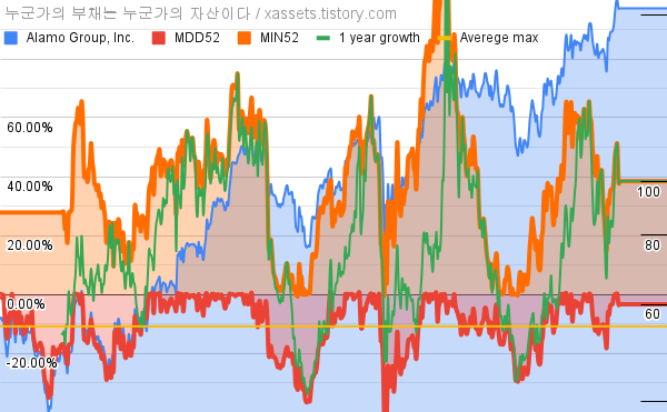 - 알라모 그룹의 10년 평균 MDD는 -10.89%고, 52주 최저가 대비 평균 상승률은 37.78%다.