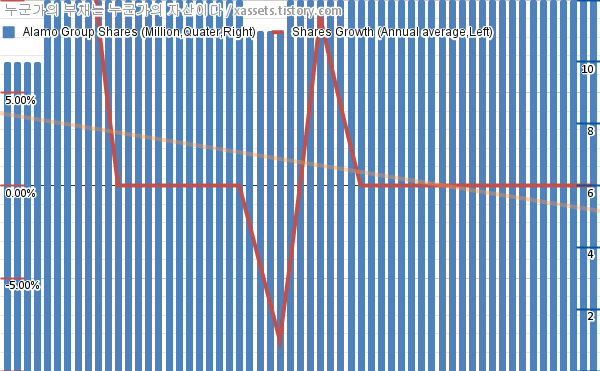 - 지난 1년 동안 알라모 그룹은 평균 0.00%의 자사주를 매입-소각했다.
