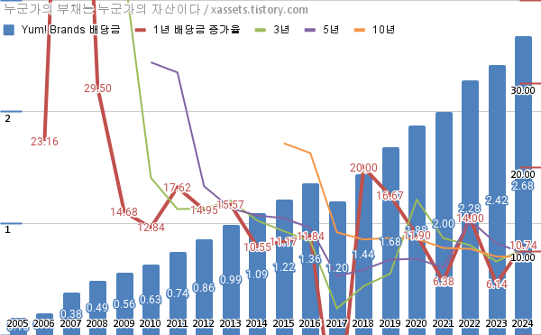 염! 브랜즈 배당금 및 배당성장률 차트 (2005년~2024년)
