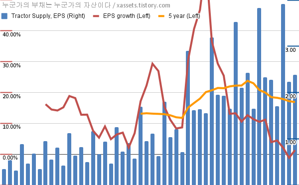 - 포스팅일 기준, 트랙터 서플라이의 1, 5년 연평균 EPS 성장률은 1.29%, 16.91%이다.