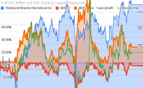 - 레스토랑 브랜즈의 10년 평균 MDD는 -23.87%고, 52주 최저가 대비 평균 상승률은 156.21%다.