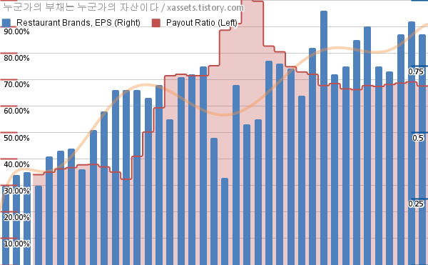 레스토랑 브랜즈 EPS 성장률, 배당성향 차트 (2015년~2024년)