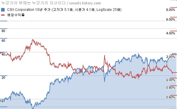 CSX 주식회사 배당수익률 및 주가 상승률 차트 (2014년~2024년)