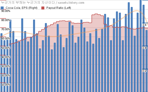 코카콜라 EPS 성장률, 배당성향 차트 (2012년~2024년)