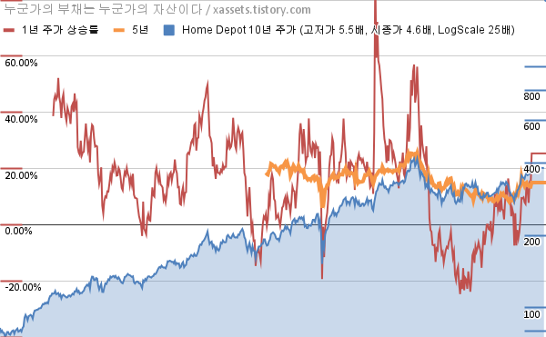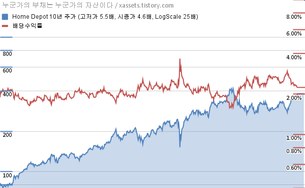 - 포스팅일 기준, 홈 디포의 1, 3, 5, 10년 연평균 주가상승률은 25.38%, 12.92%, 14.97%, 16.25%이다.