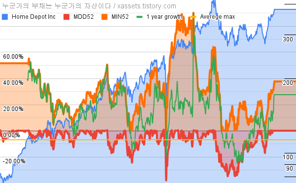 - 홈 디포의 10년 평균 MDD는 -6.89%고, 52주 최저가 대비 평균 상승률은 30.16%다.
