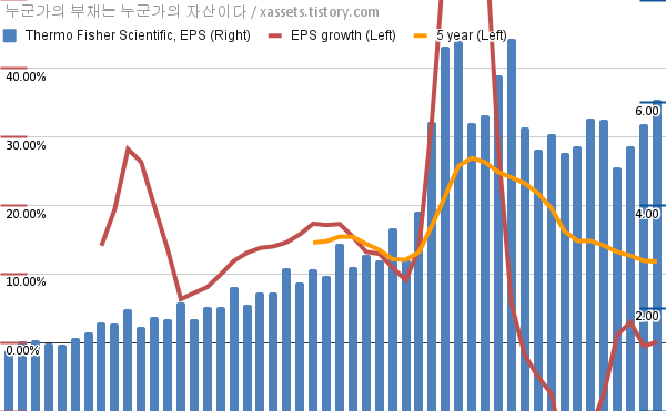 - 포스팅일 기준, 써모피셔 사이언티픽의 1, 5년 연평균 EPS 성장률은 0.09%, 11.81%이다.
