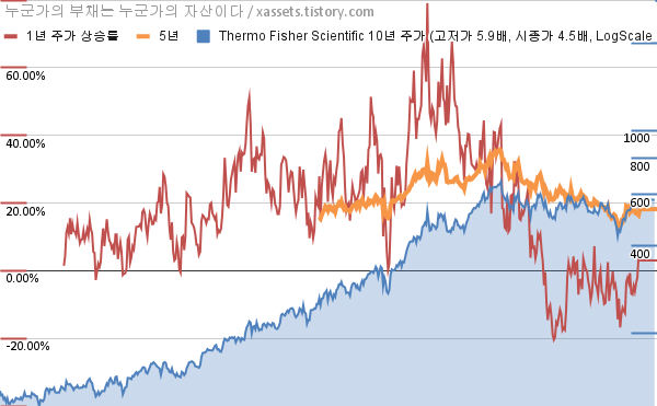 - 포스팅일 기준, 써모피셔 사이언티픽의 1, 3, 5, 10년 연평균 주가상승률은 3.02%, 8.85%, 18.19%, 16.77%이다.