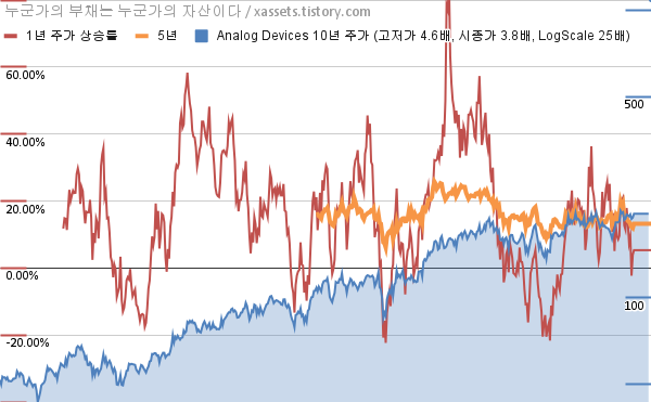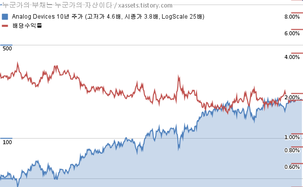 - 포스팅일 기준, 아날로그 디바이스의 1, 3, 5, 10년 연평균 주가상승률은 5.32%, 9.63%, 13.23%, 14.63%이다.