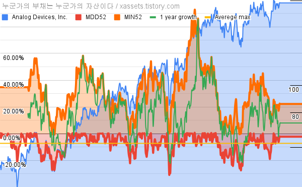 - 아날로그 디바이스의 10년 평균 MDD는 -7.32%고, 52주 최저가 대비 평균 상승률은 30.79%다.