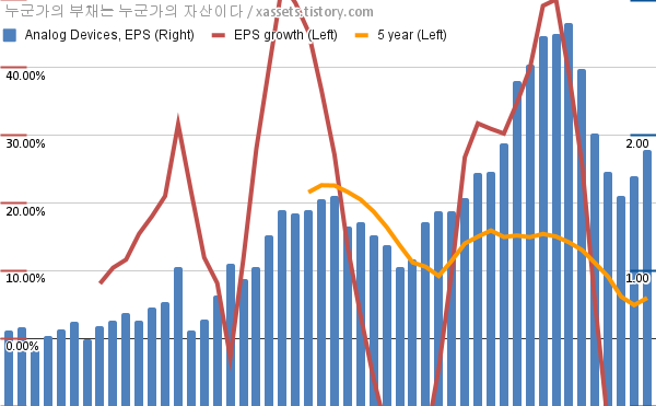 - 포스팅일 기준, 아날로그 디바이스의 1, 5년 연평균 EPS 성장률은 -31.85%, 5.97%이다.