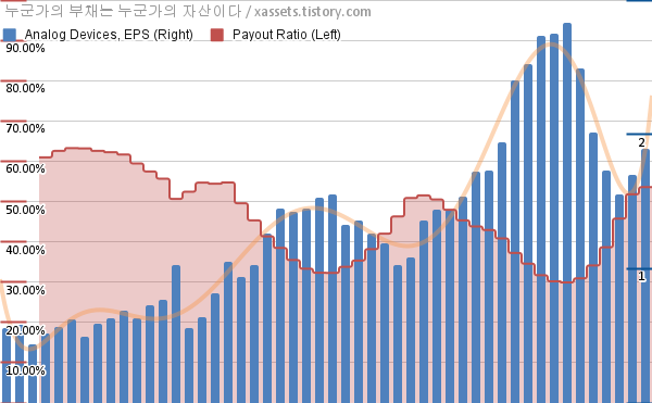 아날로그 디바이스 EPS 성장률, 배당성향 차트 (2012년~2024년)