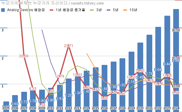 아날로그 디바이스 배당금 및 배당성장률 차트 (2005년~2024년)