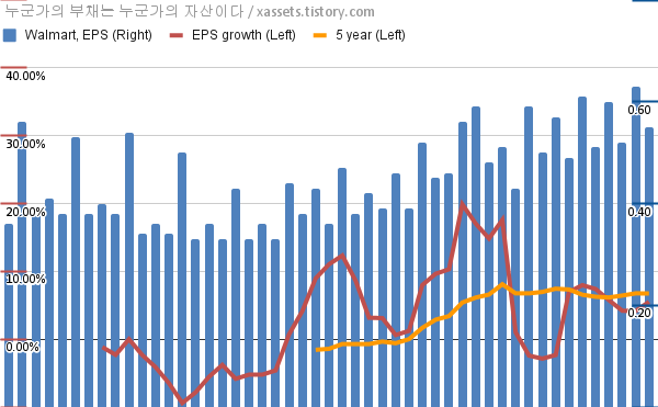 - 포스팅일 기준, 월마트의 1, 5년 연평균 EPS 성장률은 5.50%, 6.74%이다.