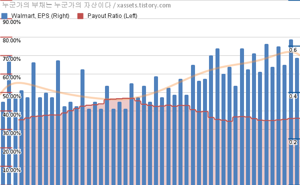 월마트 EPS 성장률, 배당성향 차트 (2012년~2024년)