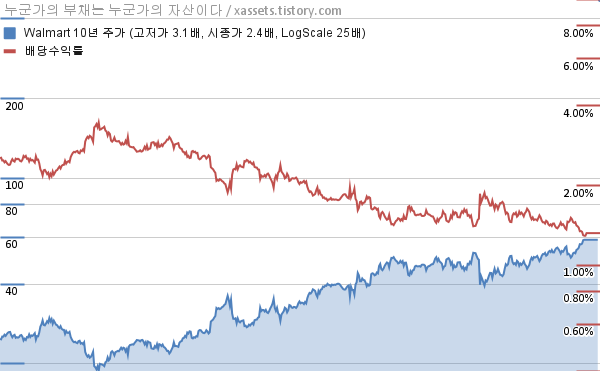 월마트 배당수익률 및 주가 상승률 차트 (2014년~2024년)