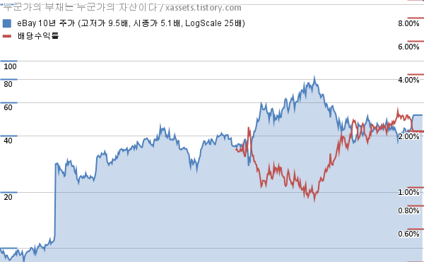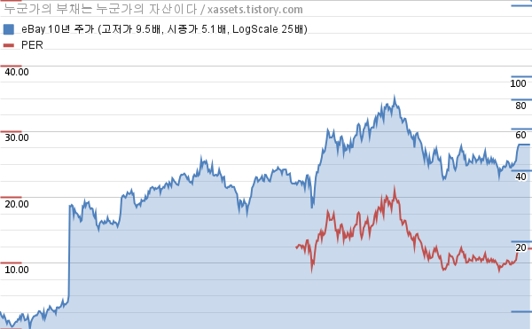 - 포스팅일 기준, 이베이의 1, 3, 5, 10년 연평균 주가상승률은 19.81%, -3.36%, 6.77%, 17.47%이다.