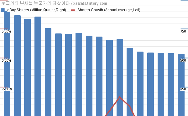 - EBAY의 가치는 거의 대부분 자사주 소각에서 나온다. 실질적인 성장이 없다시피 해도 자사주 소각과 배당으로 주식의 가치를 성장시키고 있다. 만약 성장을 못하고 있는 이베이가 한계 수준의 주주환원정책을 하지 않으면 창출하는 가치 대비 주가가 한참 낮아질 것이고, 그 차액을 노리고 들어오는 외부 펀드에 의해 M&A 되거나 청산당할 가능성이 높다.