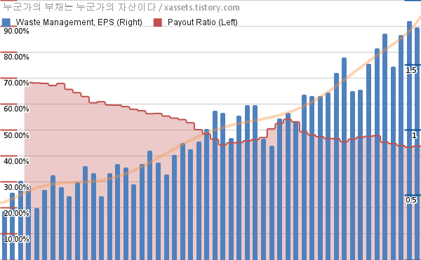 - 웨이스트 매니지먼트는 2004년부터 21년 연속으로 배당금을 증액하고 있다. 배당금 지급 내역은 아래 연도별 배당금에서 확인할 수 있다.