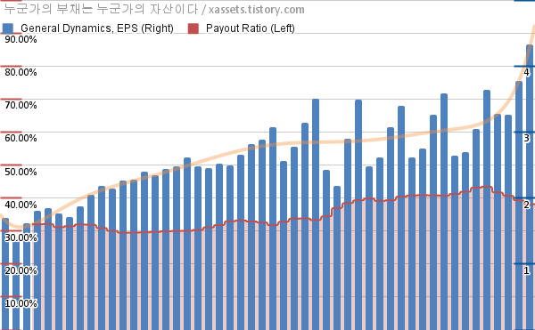 제너럴 다이내믹스 EPS 성장률, 배당성향 차트 (2012년~2024년)