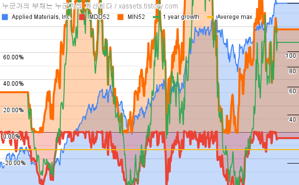 - 어플라이드 머티어리얼즈의 10년 평균 MDD는 -13.27%고, 52주 최저가 대비 평균 상승률은 60.85%다.