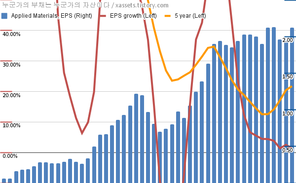 - 포스팅일 기준, 어플라이드 머티어리얼즈의 1, 5년 연평균 EPS 성장률은 1.37%, 21.75%이다.