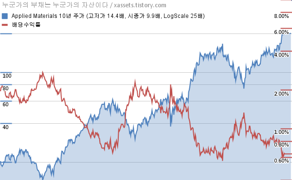 어플라이드 머티어리얼즈 배당수익률 및 주가 상승률 차트 (2014년~2024년)