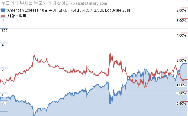 아메리칸 익스프레스 배당수익률 및 주가 상승률 차트 (2014년~2024년)