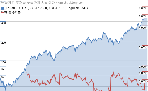 페라리 배당수익률 및 주가 상승률 차트 (2015년~2024년)