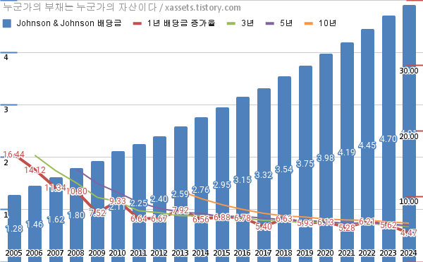 - 존슨앤존슨의 2024년 기준 1, 3, 5, 10년 연평균 배당성장률은 4.47%, 5.43%, 5.54%, 5.93%이다.