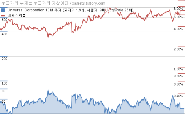 - 유니버설 코퍼레이션의 10년 평균 MDD는 -14.49%고, 52주 최저가 대비 평균 상승률은 19.73%다.