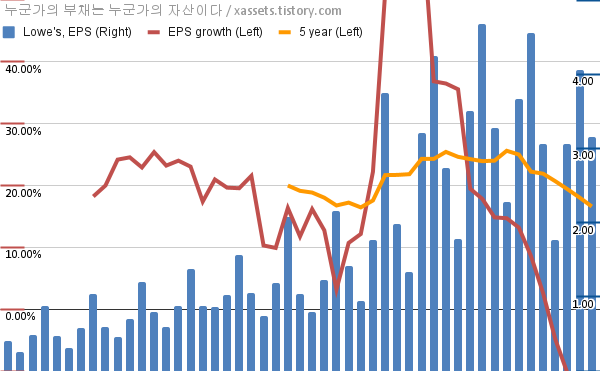 - 포스팅일 기준, 로우스의 1, 5년 연평균 EPS 성장률은 -11.35%, 16.61%이다.