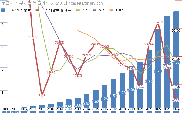 - 로우스의 2024년 기준 1, 3, 5, 10년 연평균 배당성장률은 4.65%, 17.13%, 16.91%, 18.56%이다.