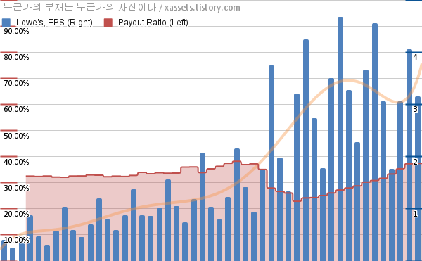 - 로우스는 1964년부터 61년 연속으로 배당금을 증액하고 있다. 배당금 지급 내역은 아래 연도별 배당금에서 확인할 수 있다.
