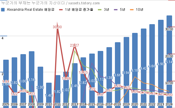 알렉산드리아 부동산 배당금 및 배당성장률 차트 (2005년~2024년)
