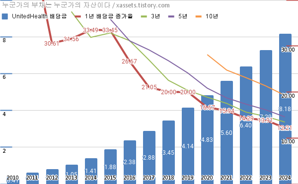 - 유나이티드헬스의 2024년 기준 1, 3, 5, 10년 연평균 배당성장률은 12.21%, 13.46%, 14.59%, 19.26%이다.
