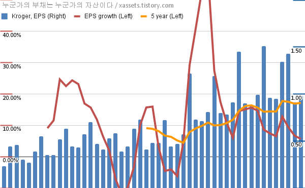 - 포스팅일 기준, 크로거의 1, 5년 연평균 EPS 성장률은 5.67%, 17.17%이다.