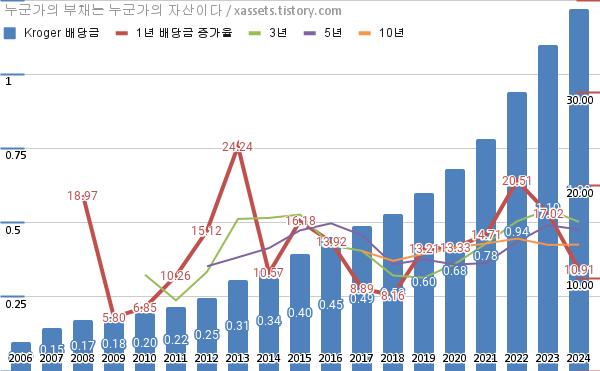 크로거 배당금 및 배당성장률 차트 (2006년~2024년)