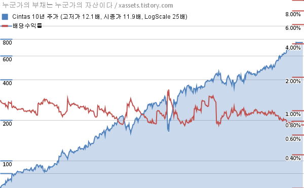신타스 배당수익률 및 주가 상승률 차트 (2014년~2024년)