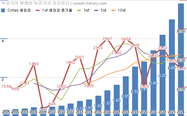 - 신타스의 2024년 기준 1, 3, 5, 10년 연평균 배당성장률은 16.40%, 19.62%, 17.94%, 21.21%이다.