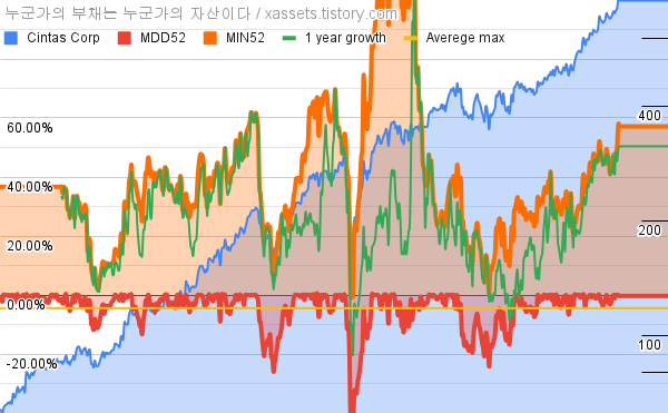 - 신타스의 10년 평균 MDD는 -4.49%고, 52주 최저가 대비 평균 상승률은 40.17%다.