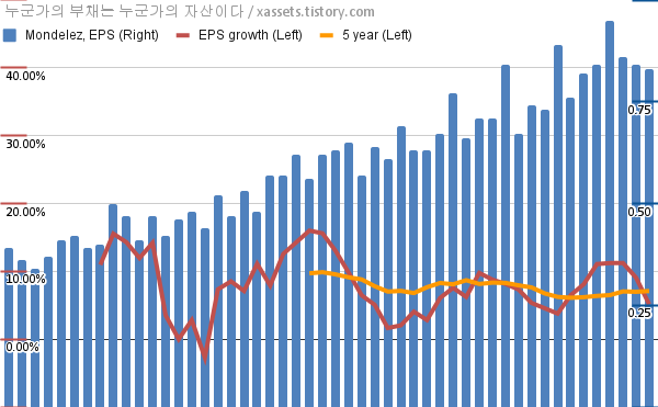 - 포스팅일 기준, 몬델리즈의 1, 5년 연평균 EPS 성장률은 5.14%, 7.10%이다.