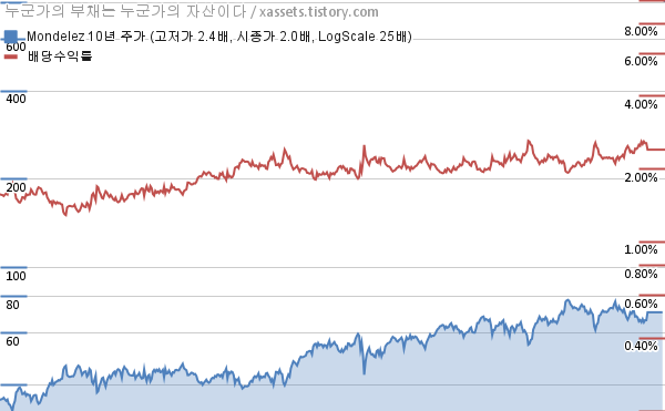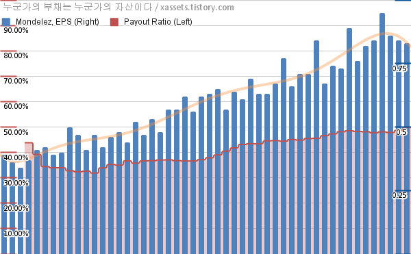 - 몬델리즈는 2014년부터 11년 연속으로 배당금을 증액하고 있다. 배당금 지급 내역은 아래 연도별 배당금에서 확인할 수 있다.