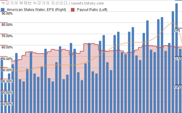 아메리칸 스테이츠 워터 EPS 성장률, 배당성향 차트 (2012년~2024년)